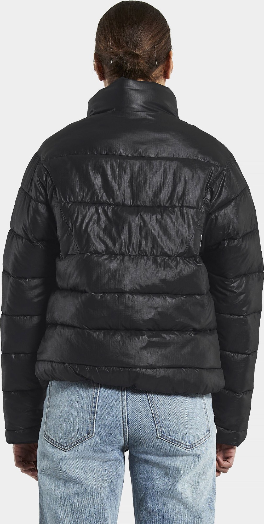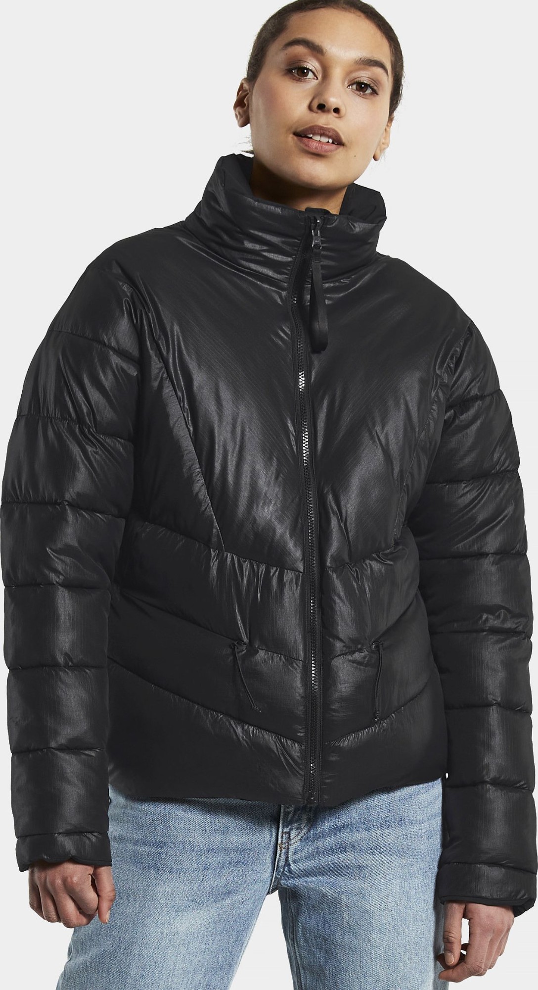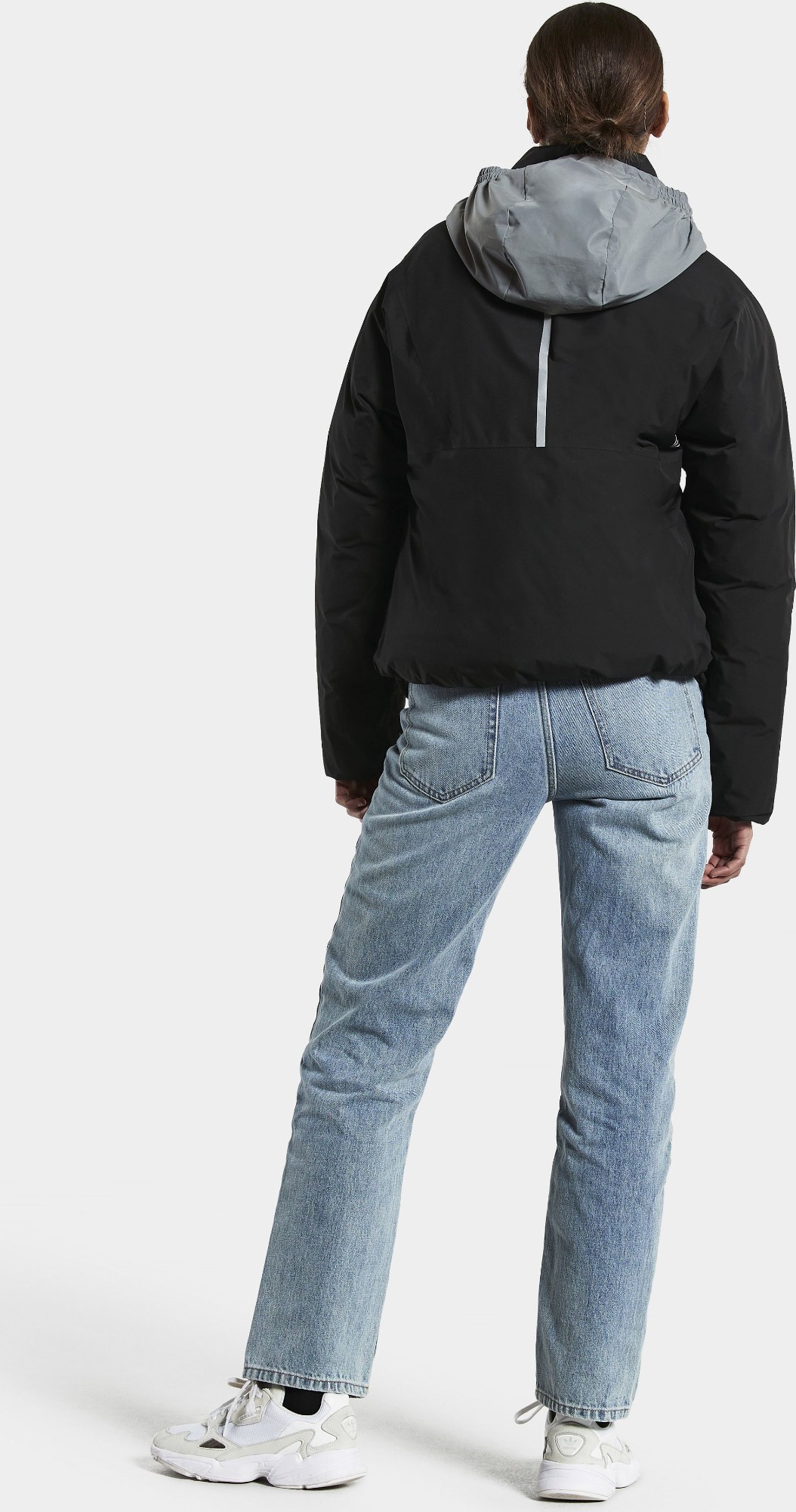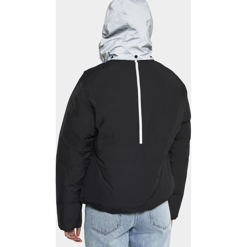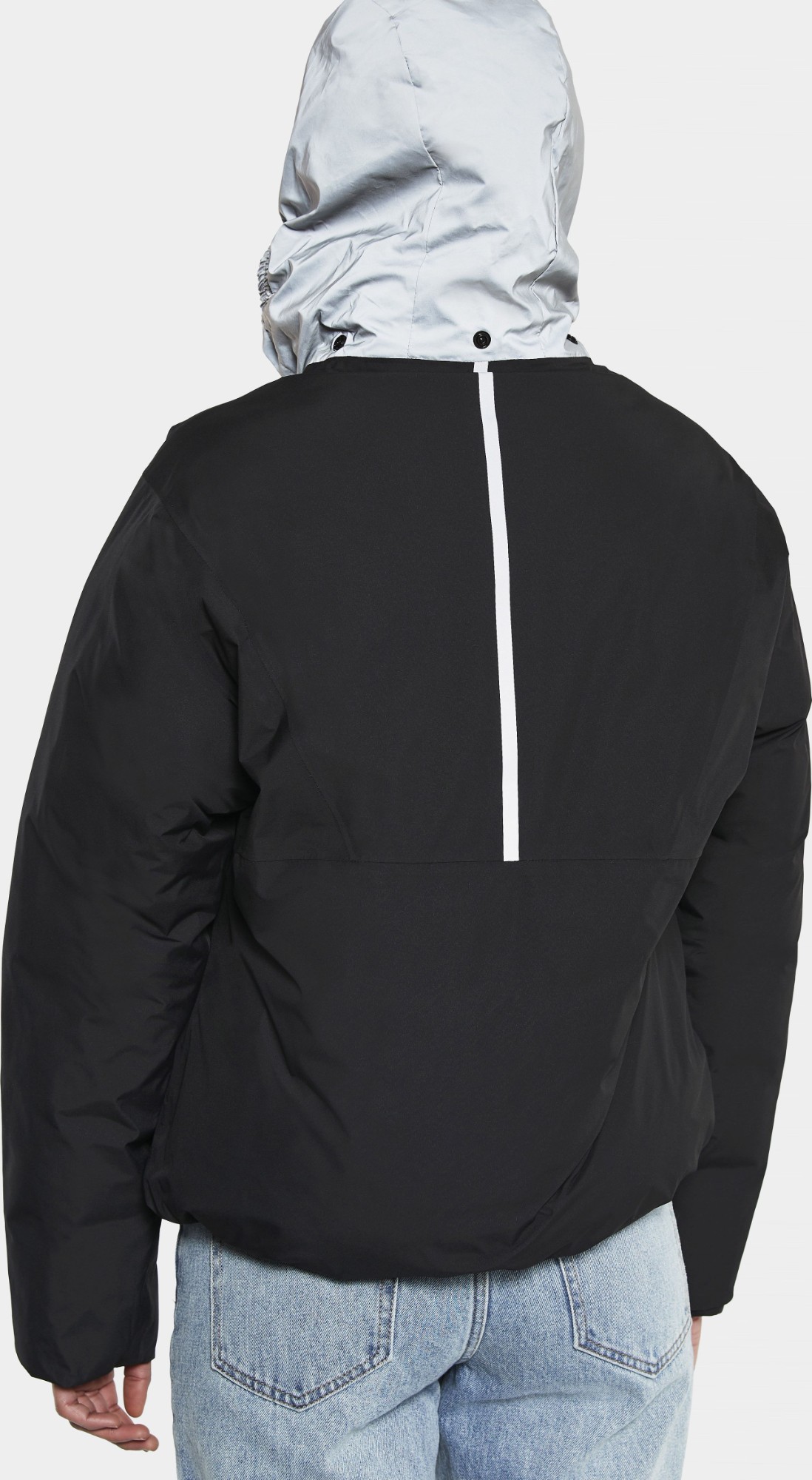 Anni is a reversible, padded jacket with multi-usage and two different expressions on each side. One is a shiny, modern puffer side, the other a waterproof, clean, matte look with reflective details. It is fully windproof and waterproof with taped seams when worn with the plain side out, and has an oversized fit with a straight, boxy shape. Anni has an adjustable hem and a full-length front zip with a protective storm flap on the puffer side and button closure on the plain side. Hidden, reflective hood. It has two zipped front pockets on the puffer side, two buttoned front pockets on the plain side. The jacket is padded with loose fibre padding for nice volume and warmth, and 75% of the loose fibres are recycled polyester. PFC-free water-repellent finish.