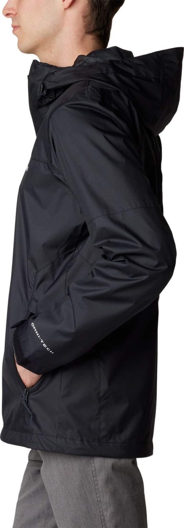 The hooded design is finished with adjustable details for a personalised fit and can be packed away into its pocket when the weather clears.