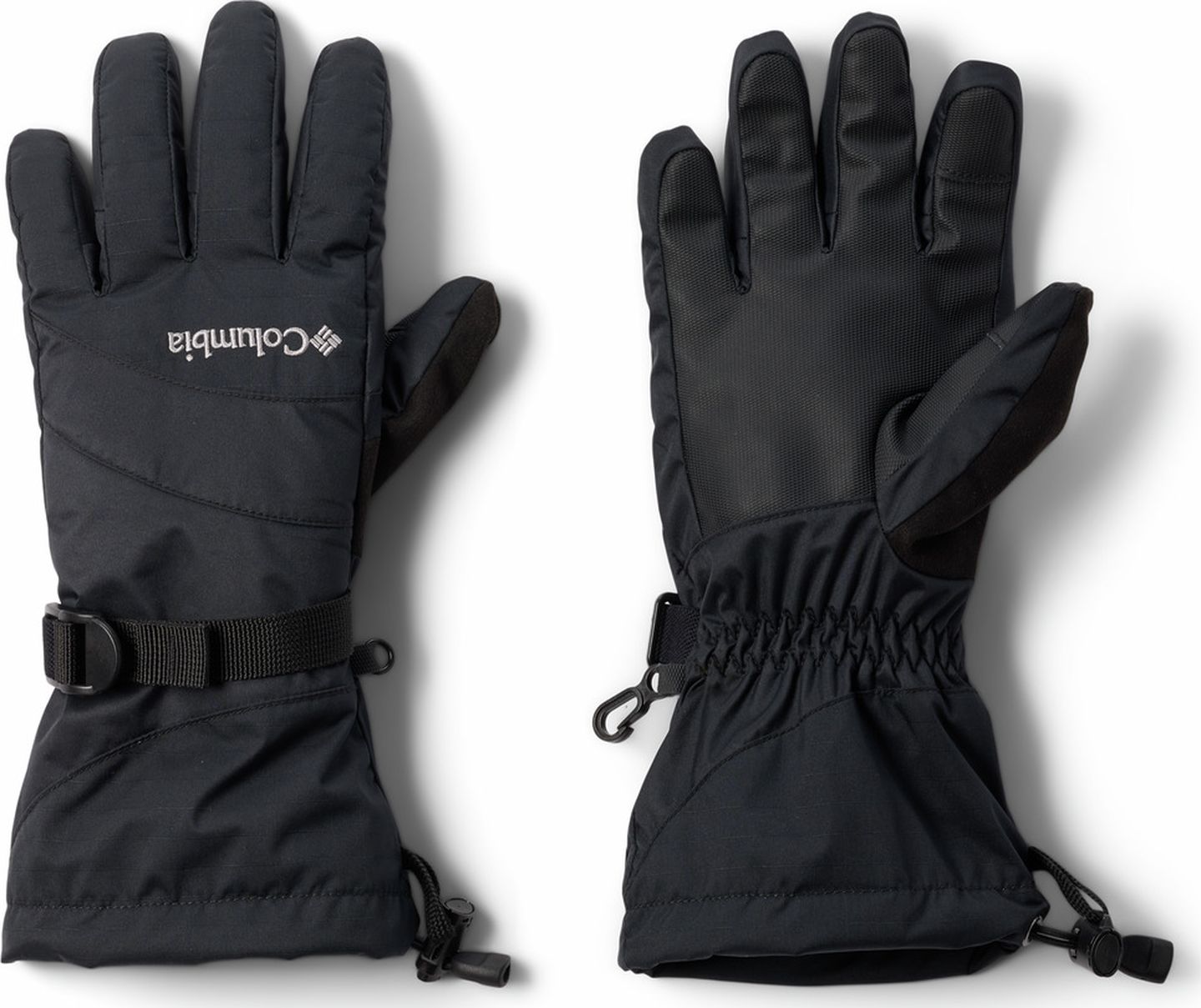 Waterproof and insulated ski gloves with long gauntlet design.