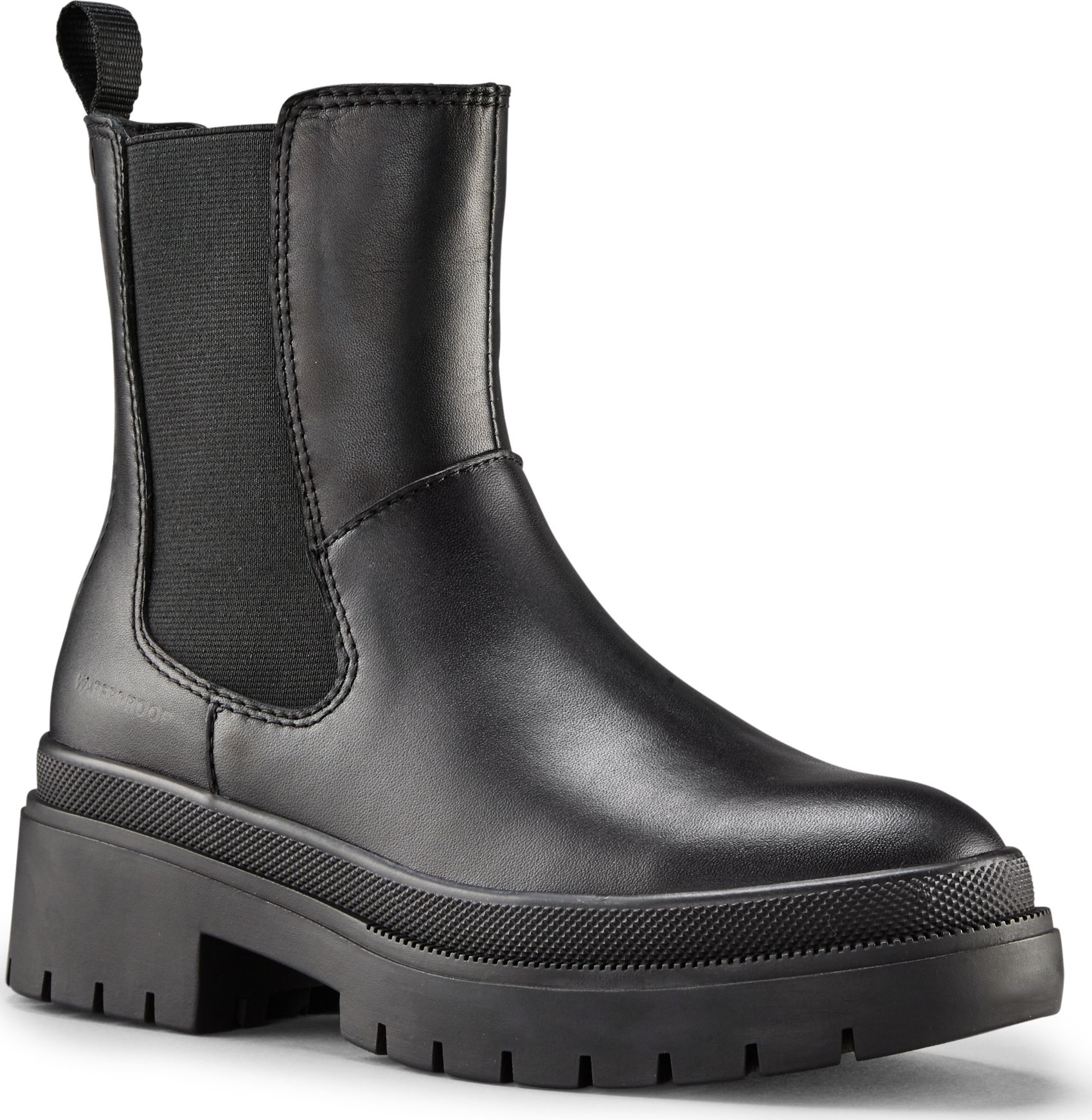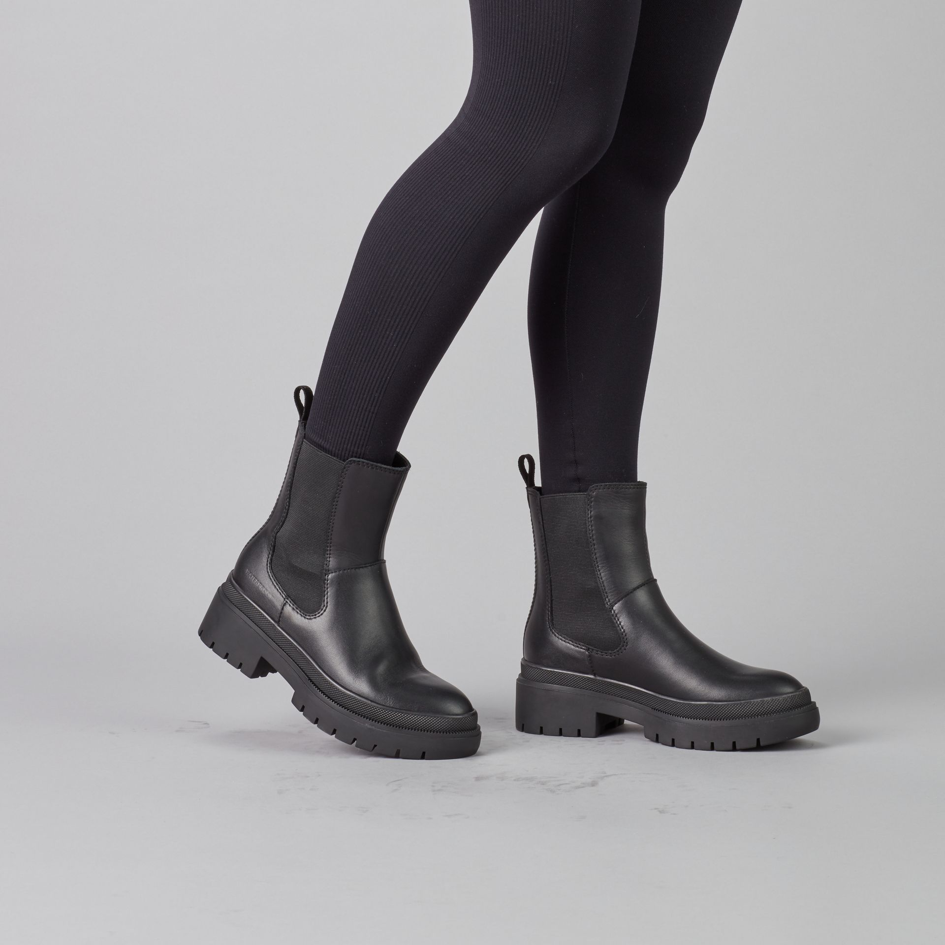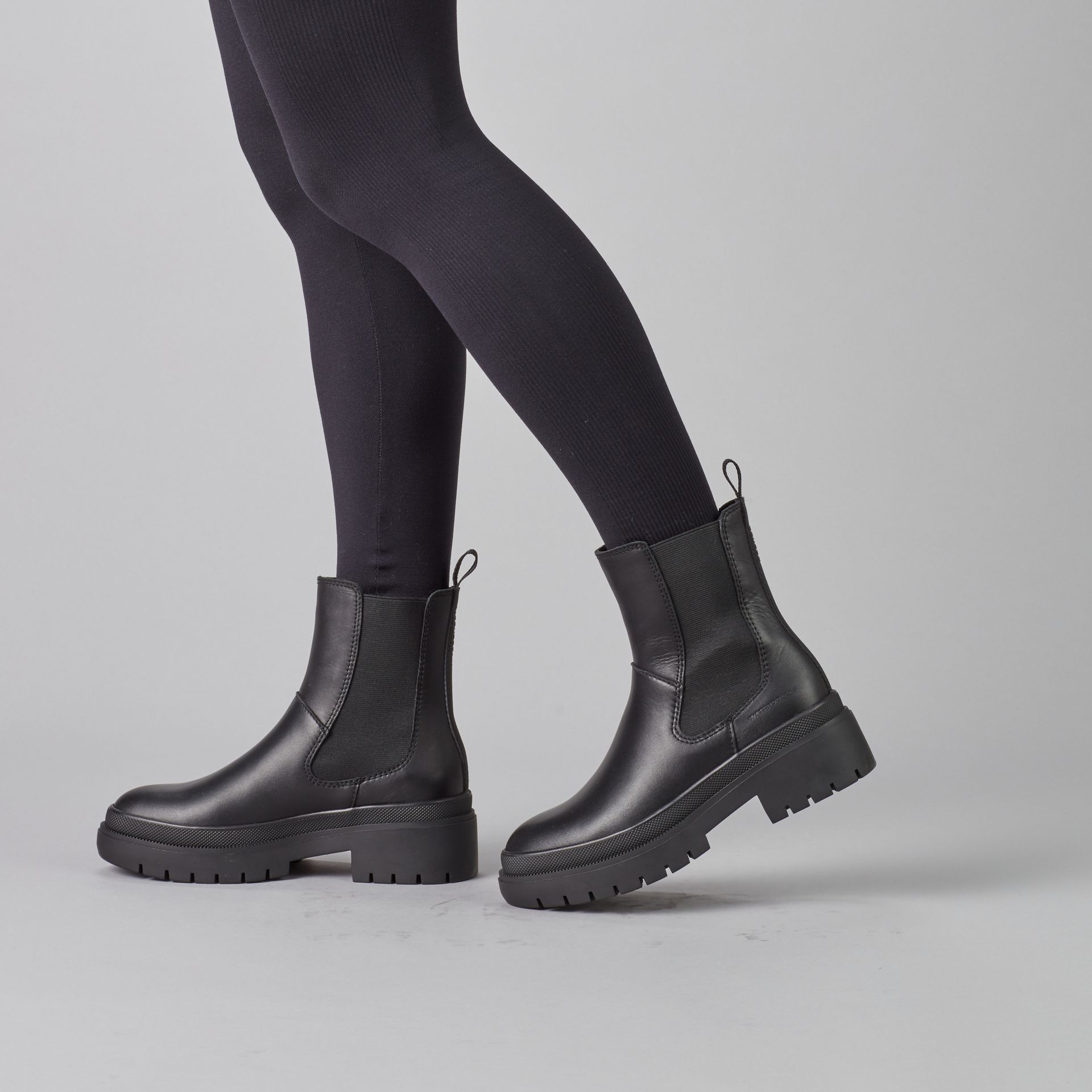 Mid-height leather chelsea boot. Rounded toe. Double elastic gore closure. Thermoplastic rubber outsole.