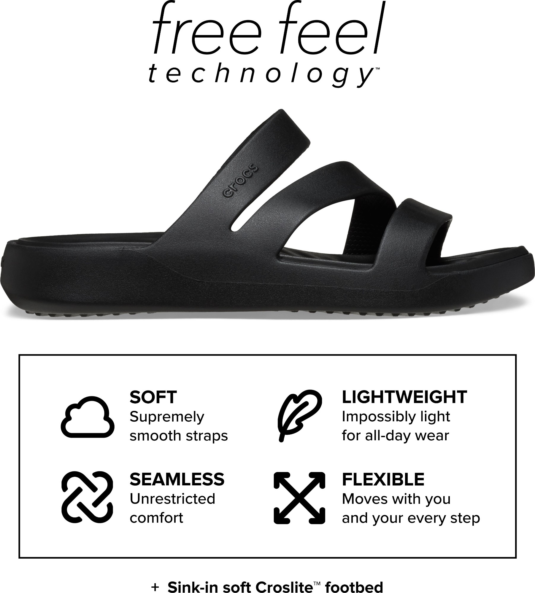 The Crocs Getaway Collection with new Free Feel Technology™ introduces our most seamless comfort innovation yet. The soft, flexible Free Feel Technology™ upper feels like nothing at all, floating on top of your foot and moving with you without restriction. With a variety of heights and stylish silhouettes, you will have a sandal for every occasion and all your getaways! Once you step in, you will never want to take them off.