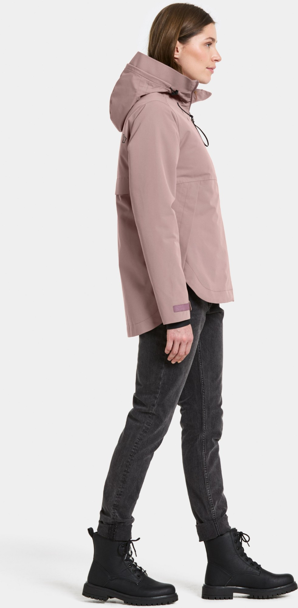 Jennie is a sleek and functional jacket designed for outdoor activities. It features a shaped hem that provides a modern silhouette and is perfect for both hiking and everyday use. The jacket is water- and windproof with taped seams and made from a breathable material, making it ideal for all weather conditions. The fixed hood is two-way adjustable and has a foam brim for extra protection. The jacket includes a two-way front zip and a practical side zip for ventilation. The cuffs are adjustable with Velcro and feature an elastic inside for added comfort. Reflective details, including a logo, increase visibility in low light.