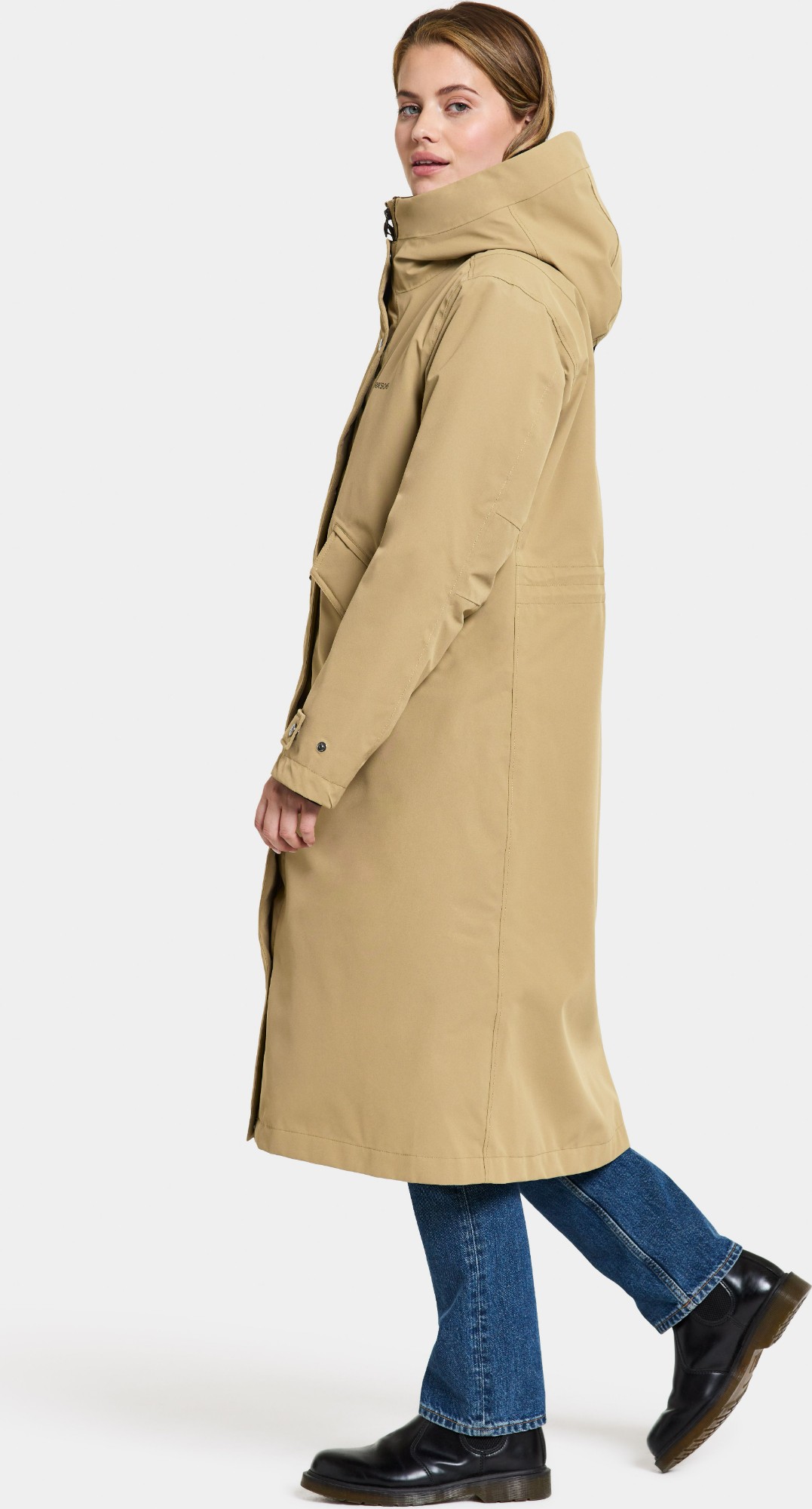 Mia is an long everyday parka with a cosy inside for the cold and rainy days. It is fully waterproof and windproof with all seams taped for extra protection. It has reflective prints on the front chest and back shoulder. A-shaped with three pockets in total. For the black colorway the fabric has been dyed using Solution Dye, a dye technique that saves up to 80% water compared to conventionally dyed polyester/polyamide fabric.
