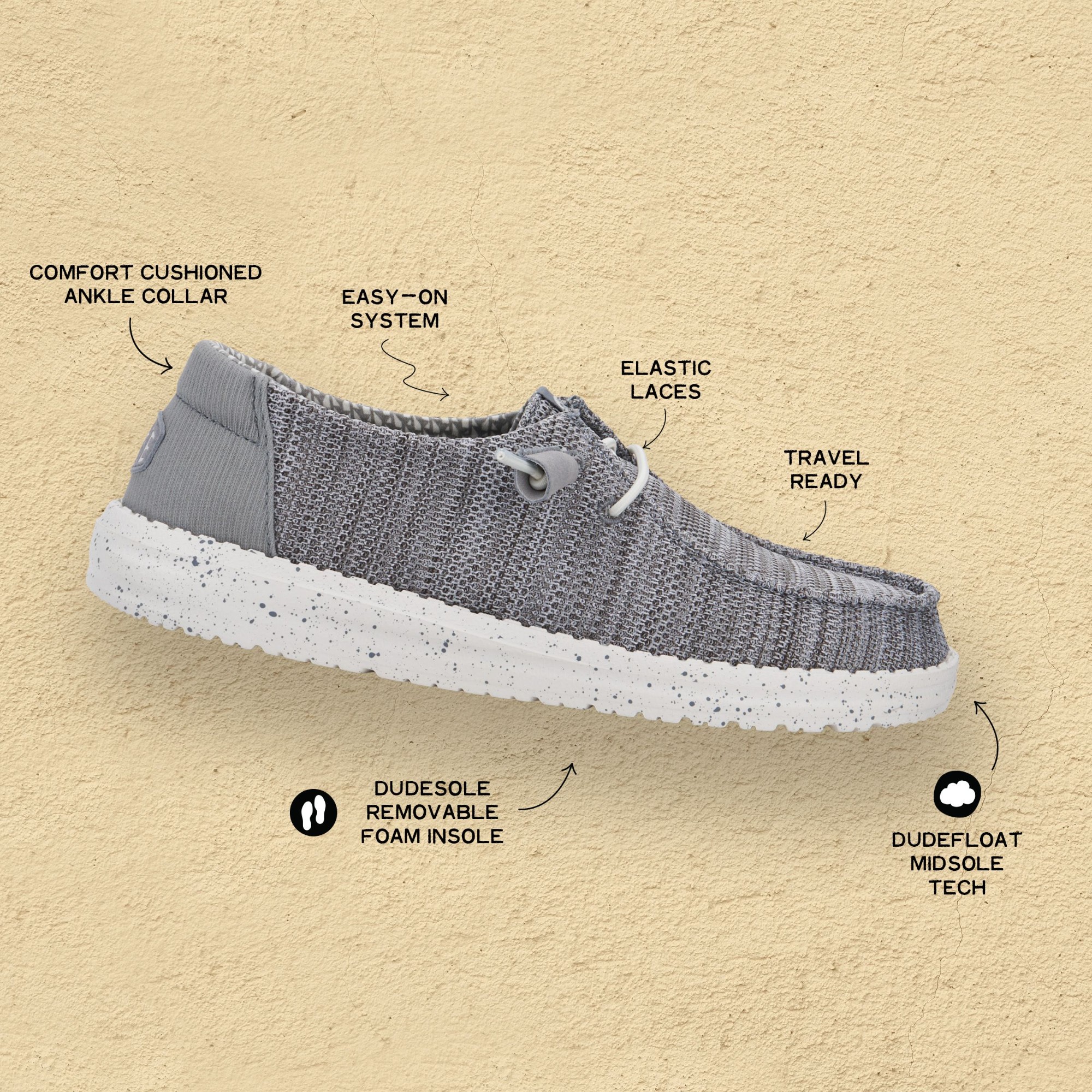 HEYDUDE kasutab looduslikku puuvilla, džuutu, lina, taaskasutatud polüestrit ja kerget EVA-talda, et tagada mugavus, hingavus ja vastupidavus.