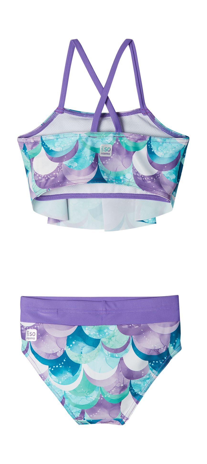 This kids' bikini set is made for mini water babies. Part of the Reima SunProof collection, the material has a UV protection factor of 50+. The lining on the front of the top gives even better coverage in the sun and there's a comfortable elasticated waist on the bottoms. Lovely flared front in the top.