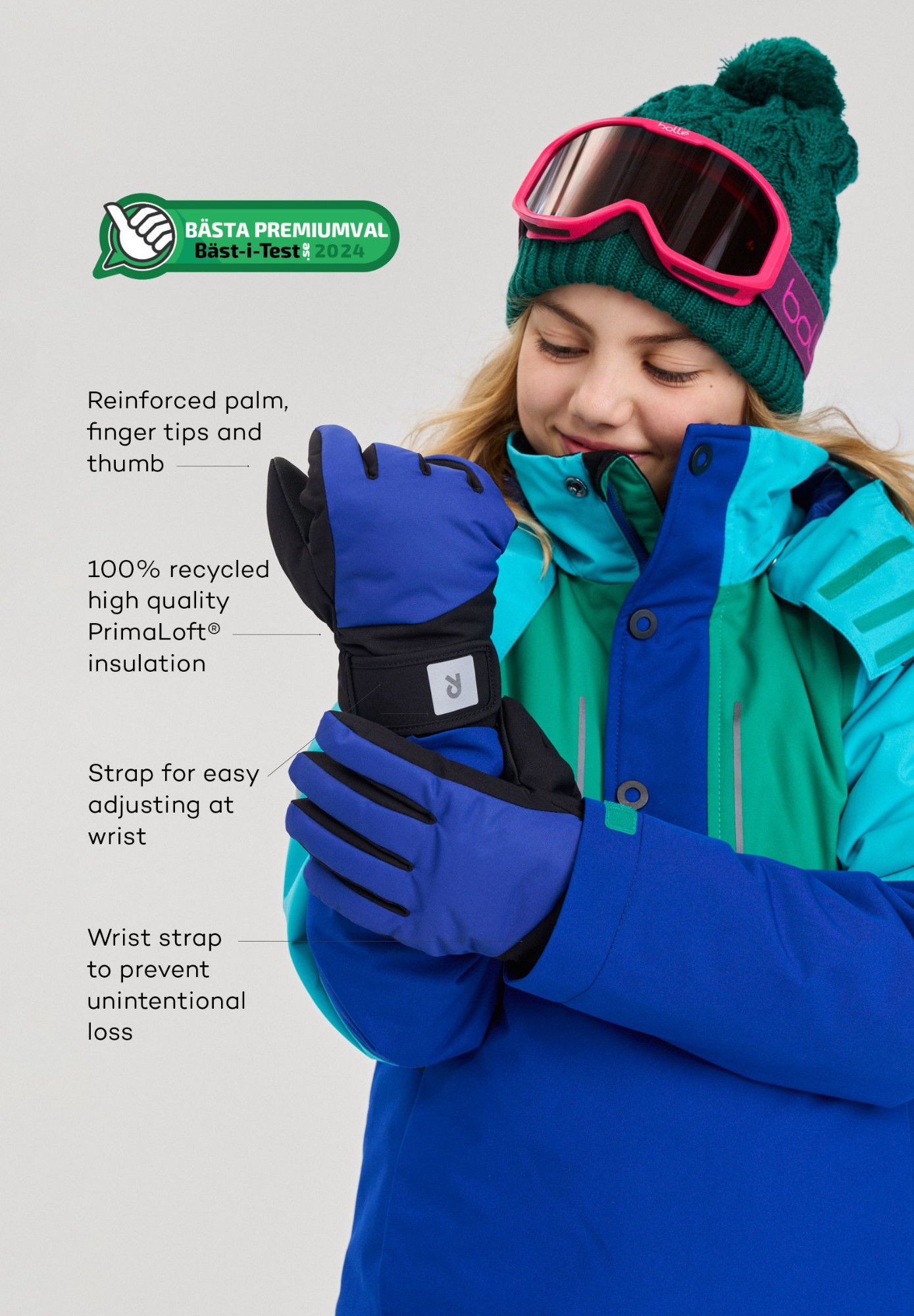 Waterproof, warm ReimaTec gloves for kids. Finished with an easy hook-and-loop strap.