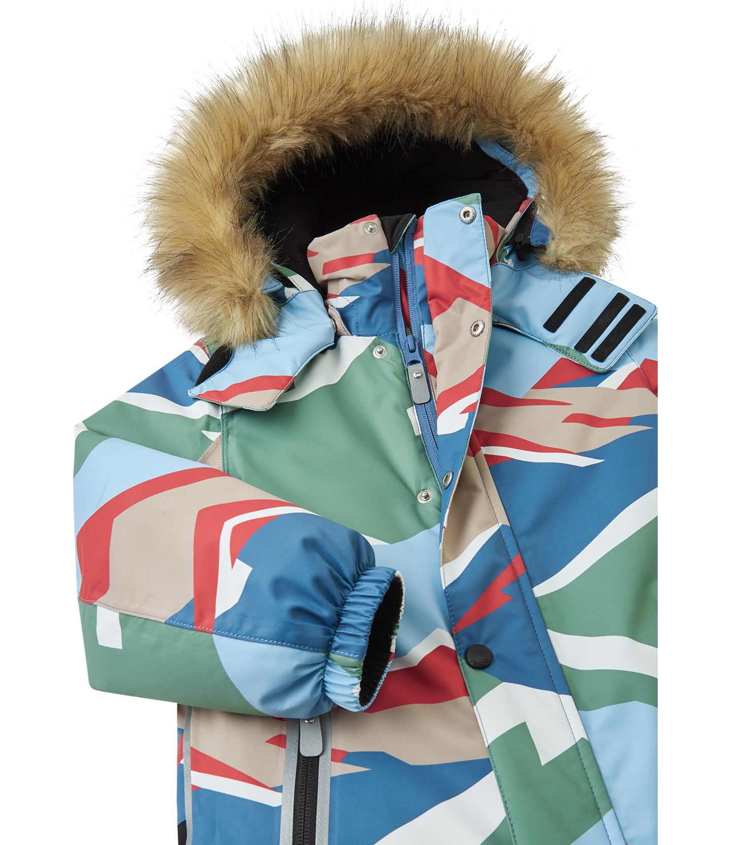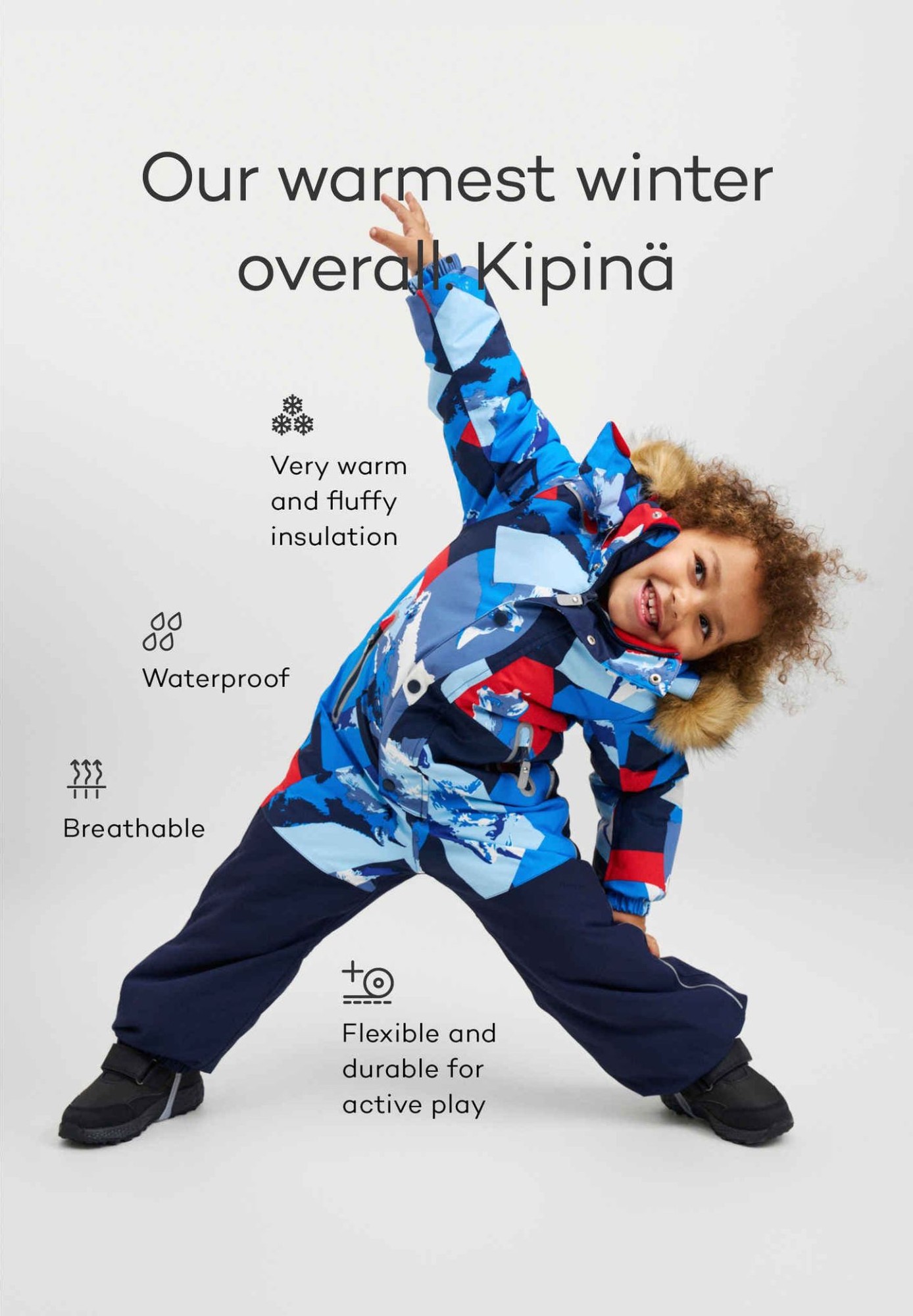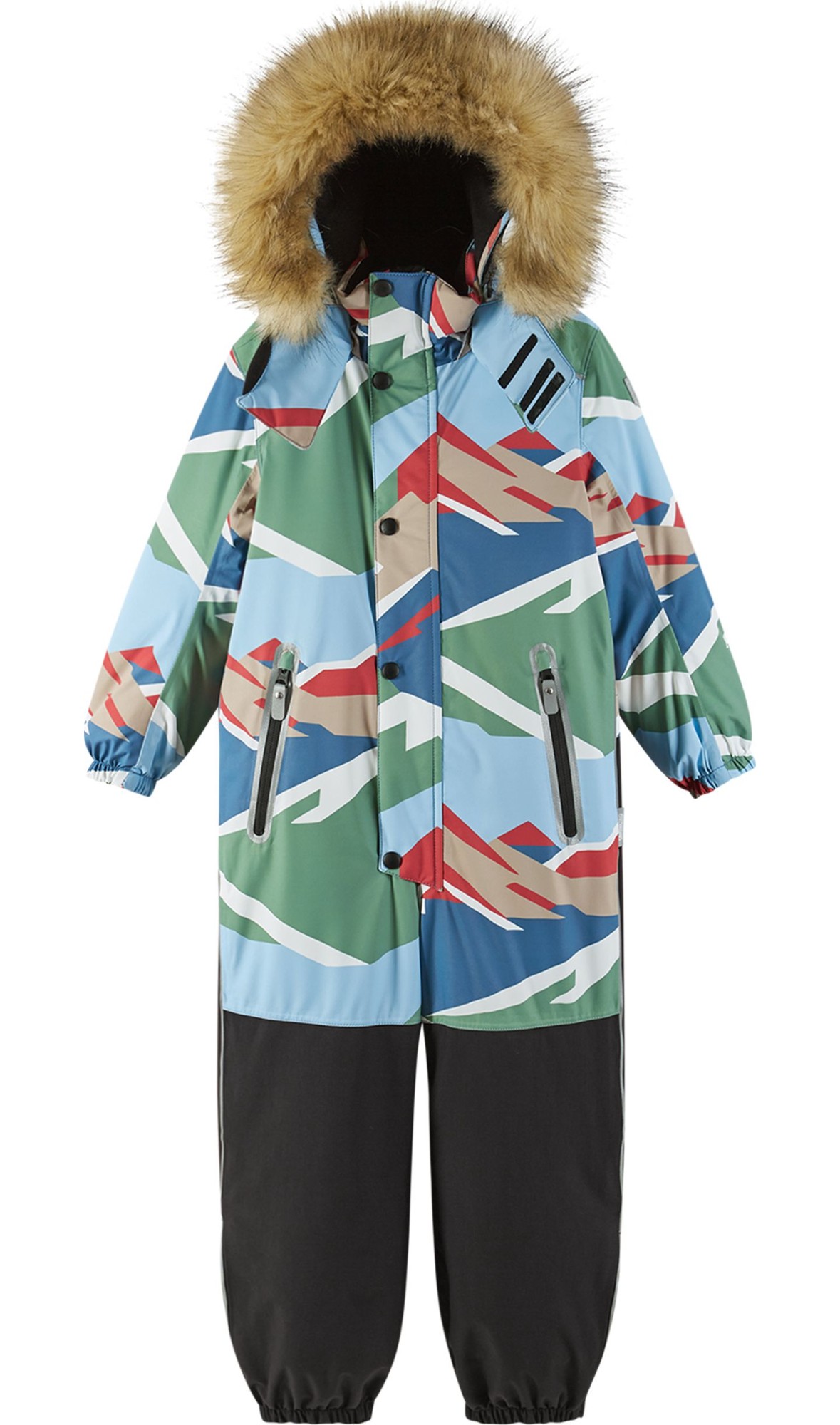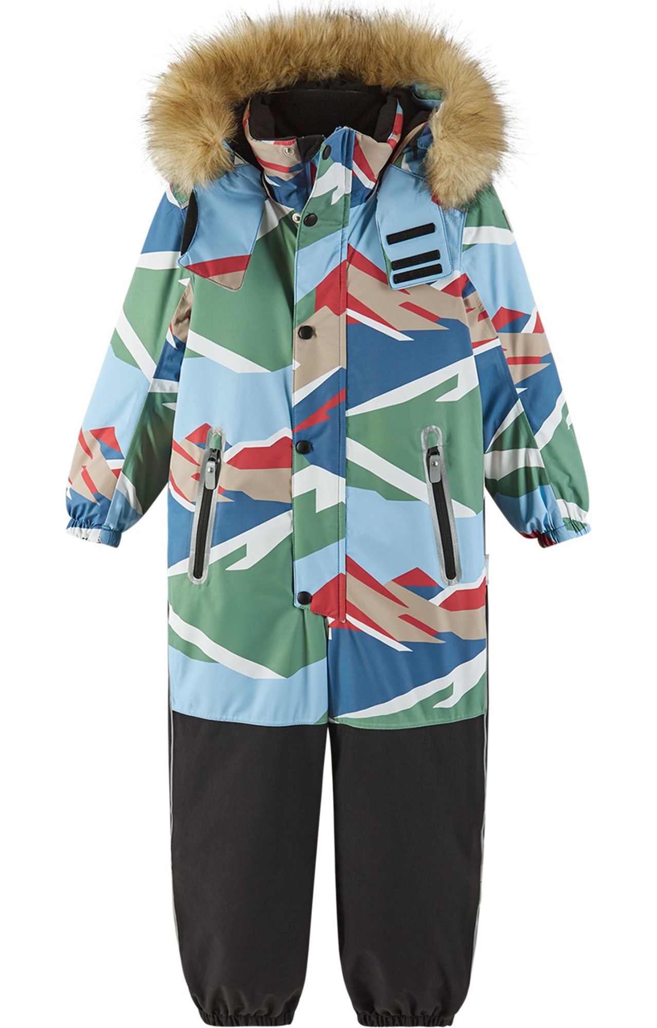Very warm Reimatec kids' snowsuit with a super durable lower part. Designed for active play. Fully waterproof. Straight fit.