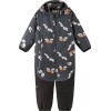 Toddlers' softshell overall blocks wind and keeps out light rains. Made from waterproof material containing recycled fibres. Breathable, soft and comfortable. Durable reinforcements on the legs.