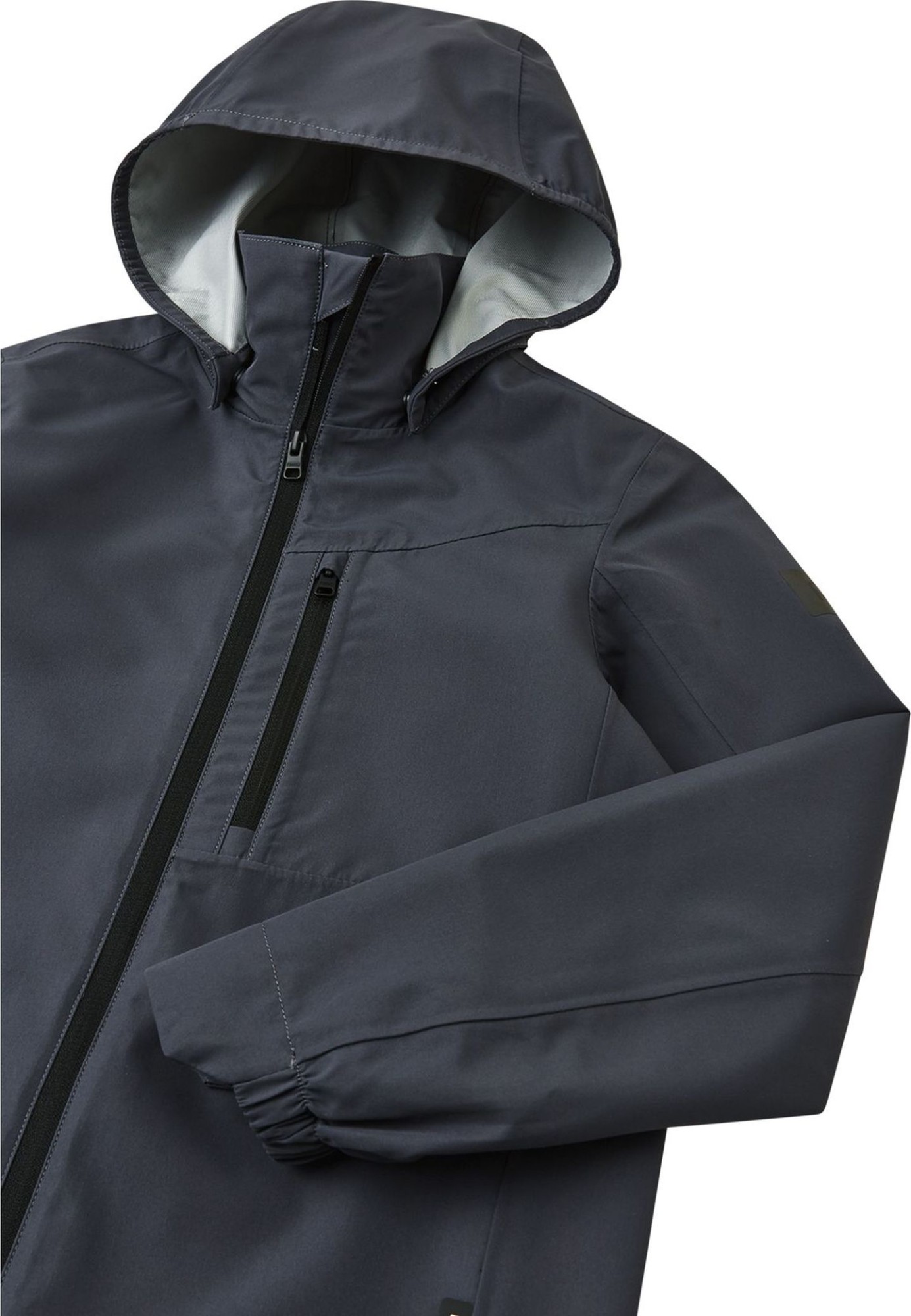 Very light, waterproof and breathable all-weather jacket for kids. 2.5 layer fabric: no lining, yet pleasant and smooth on the inside. Easy to take along, packs into small space.