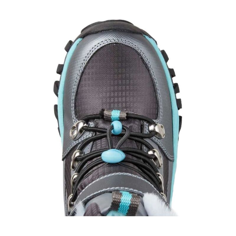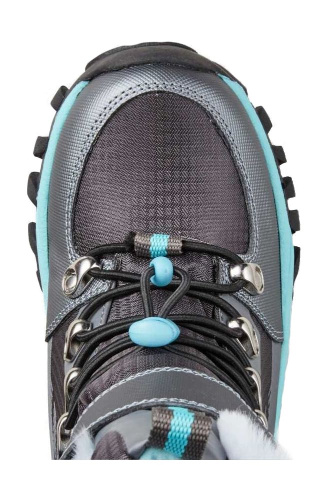Mid-calf easy pull-on nylon snow boot. Elastic stretch lace/toggle with plastic cinch. Removeable insoles.