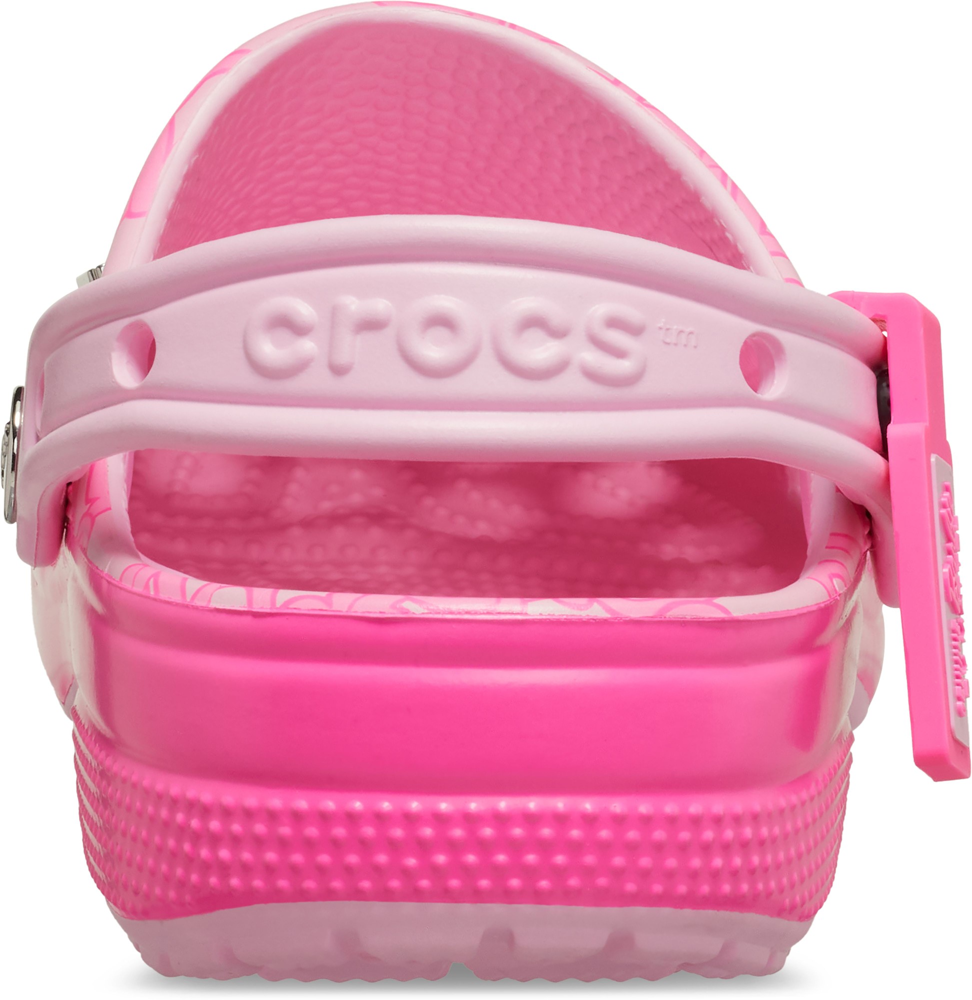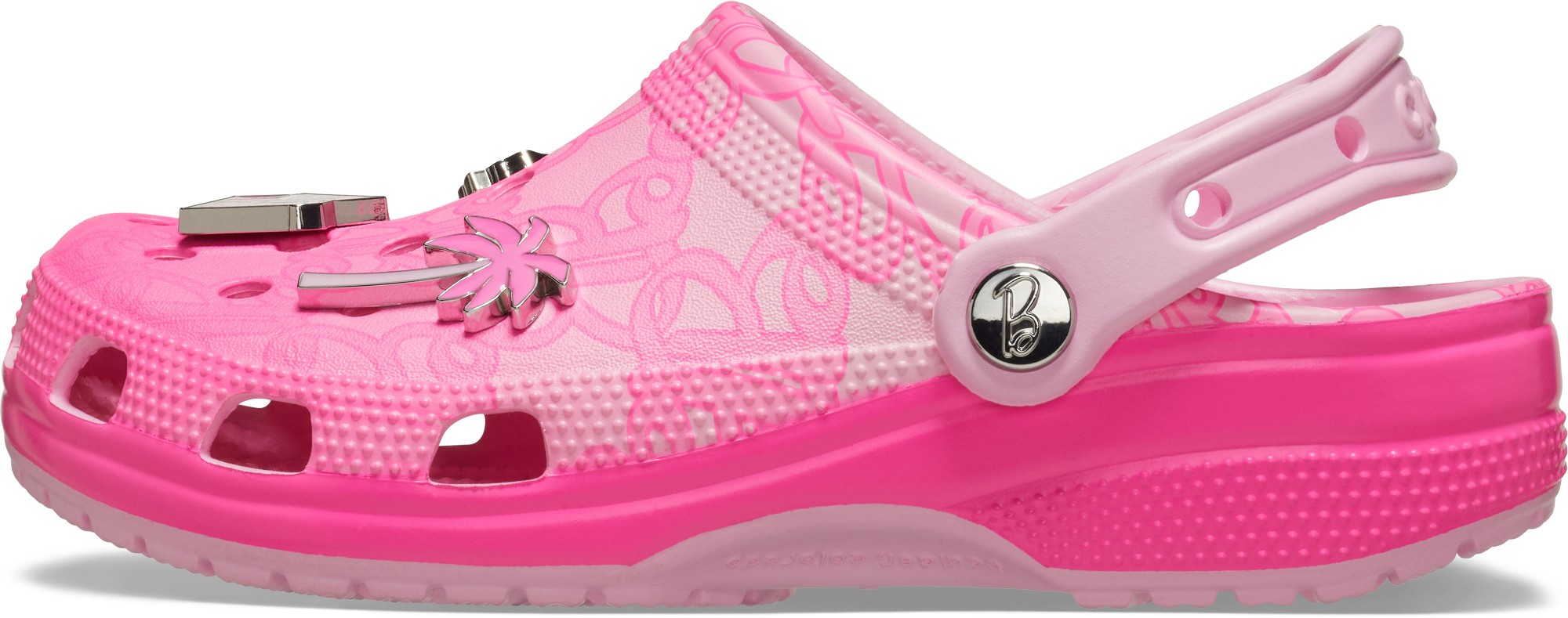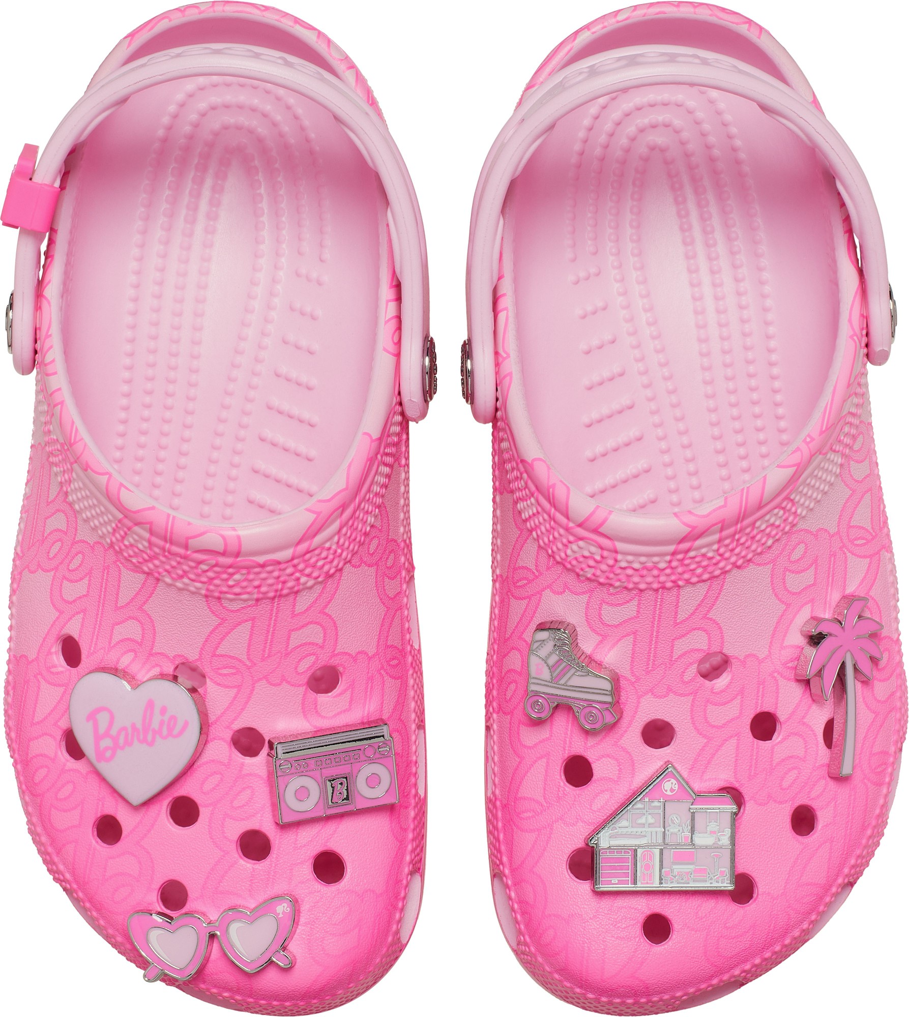 The new Barbie™ Classic Clog is the perfect statement shoe for fashion icons everywhere. This comfortably chic style comes in a pink hue with a stylish all-over monogram print. Make your look shine with elevated enamel Jibbitz™ charms featuring a Dreamhouse™, roller skate, palm tree, heart sunglasses, and Barbie™ logo.