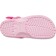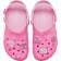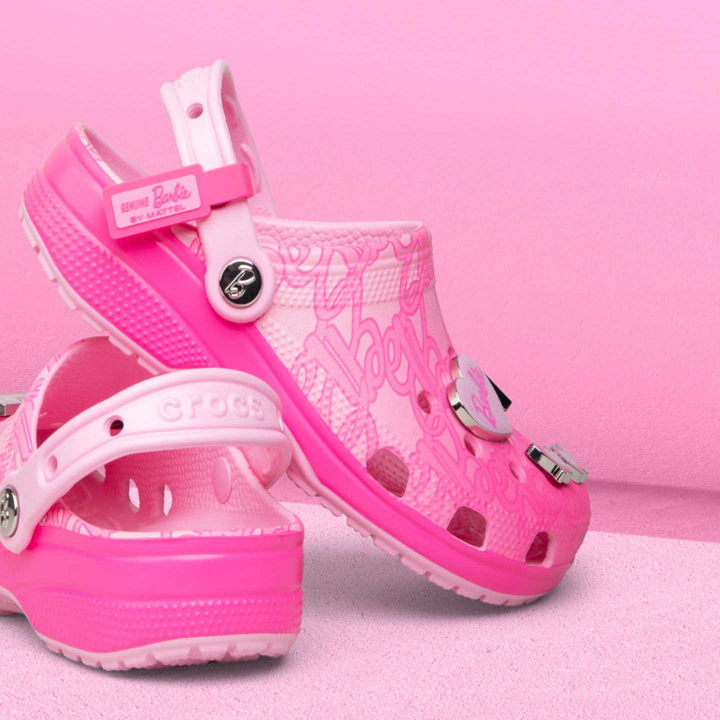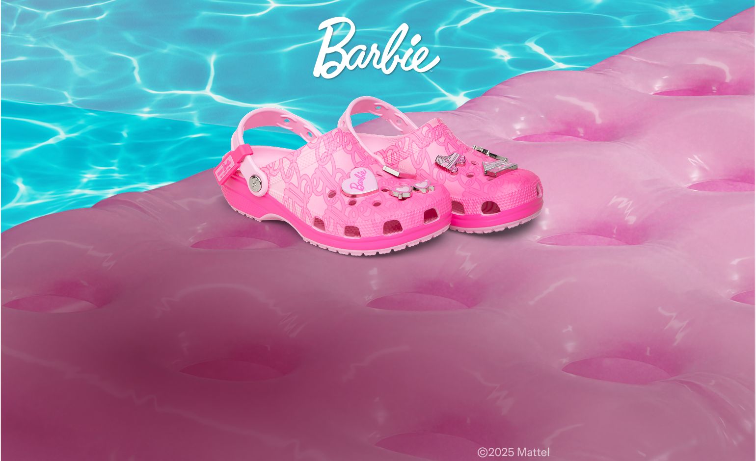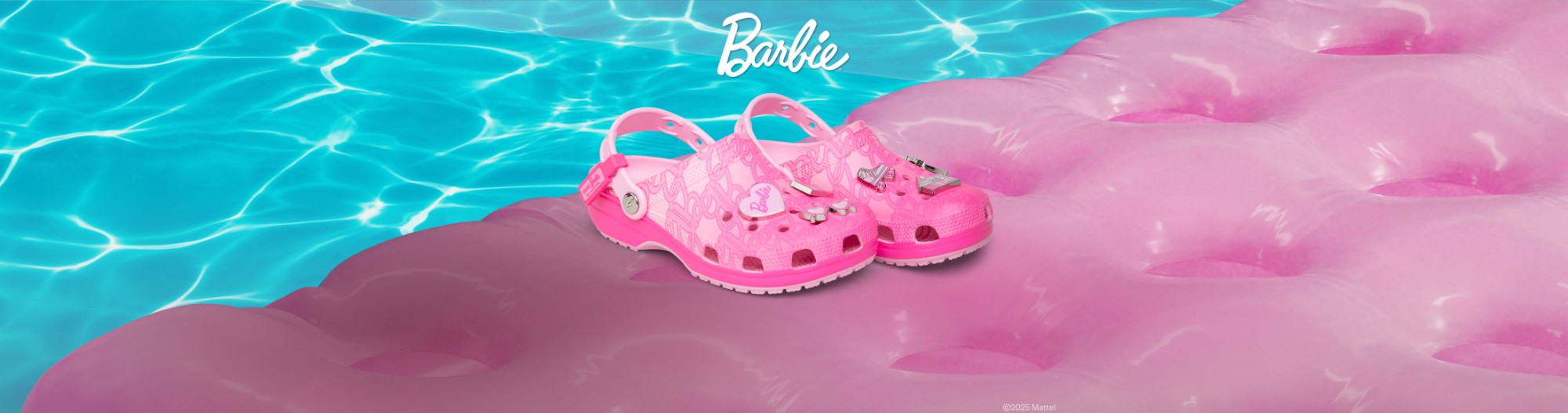 The new Barbie™ Classic Clog is the perfect statement shoe for fashion icons everywhere. This comfortably chic style comes in a pink hue with a stylish all-over monogram print. Make your look shine with elevated enamel Jibbitz™ charms featuring a Dreamhouse™, roller skate, palm tree, heart sunglasses, and Barbie™ logo.