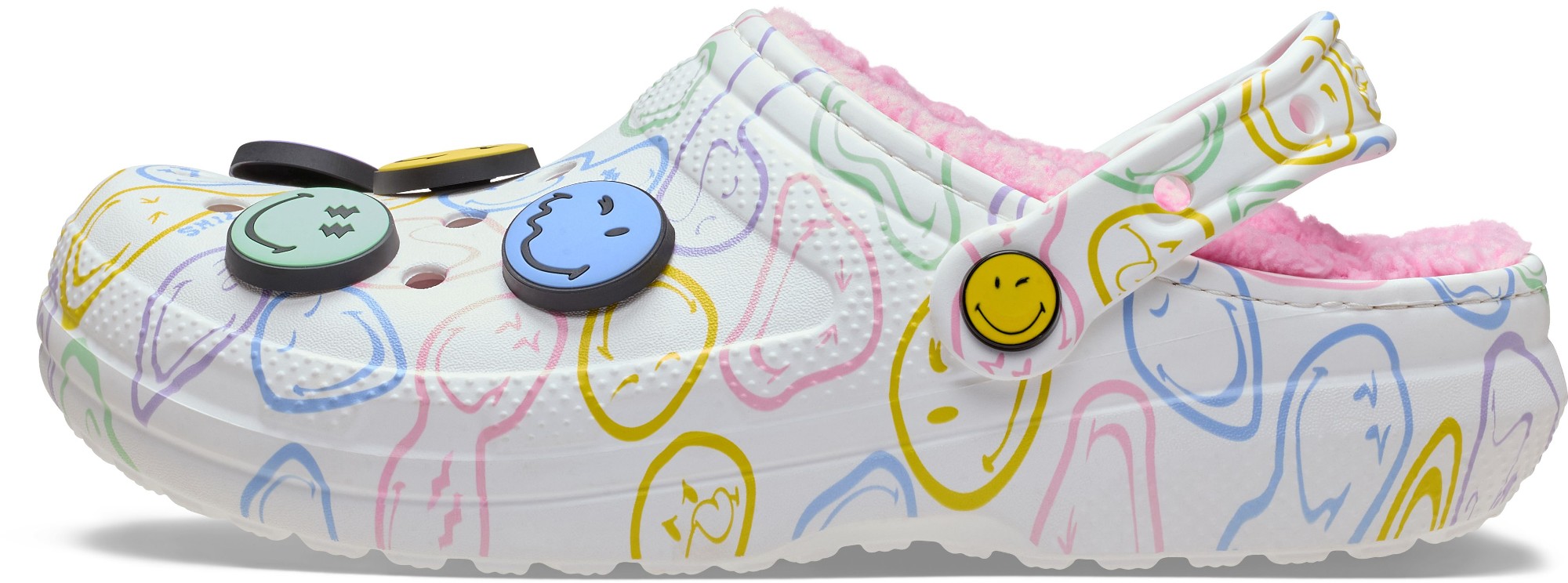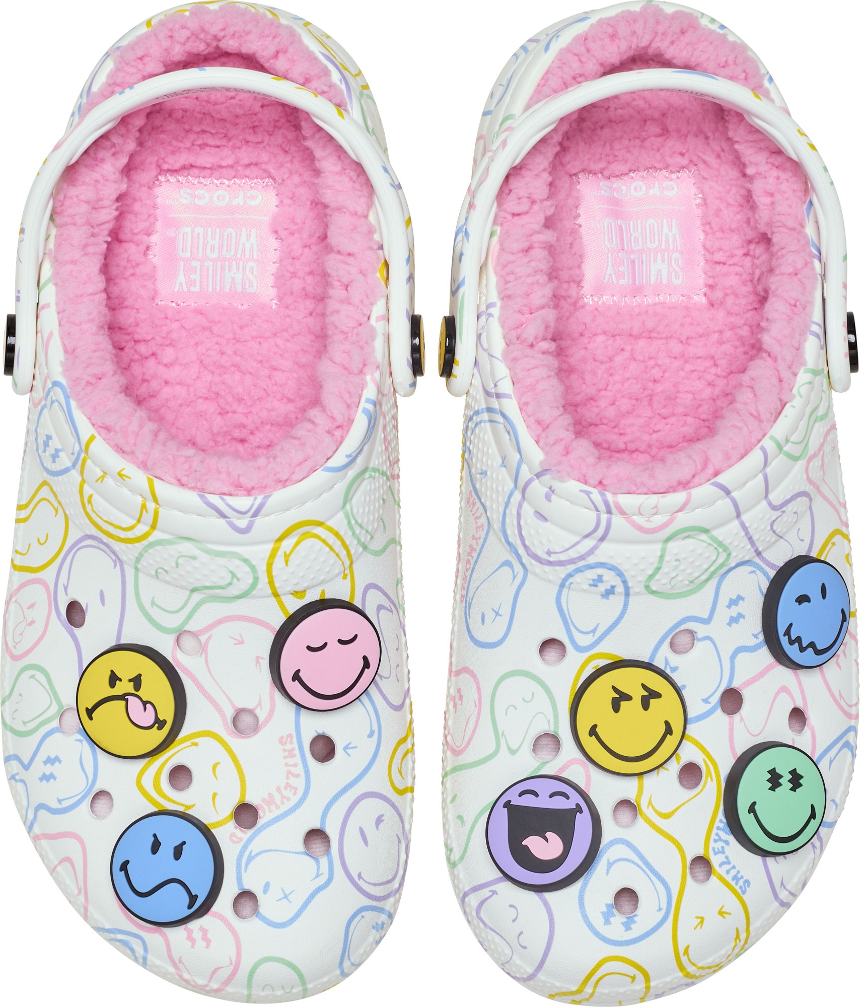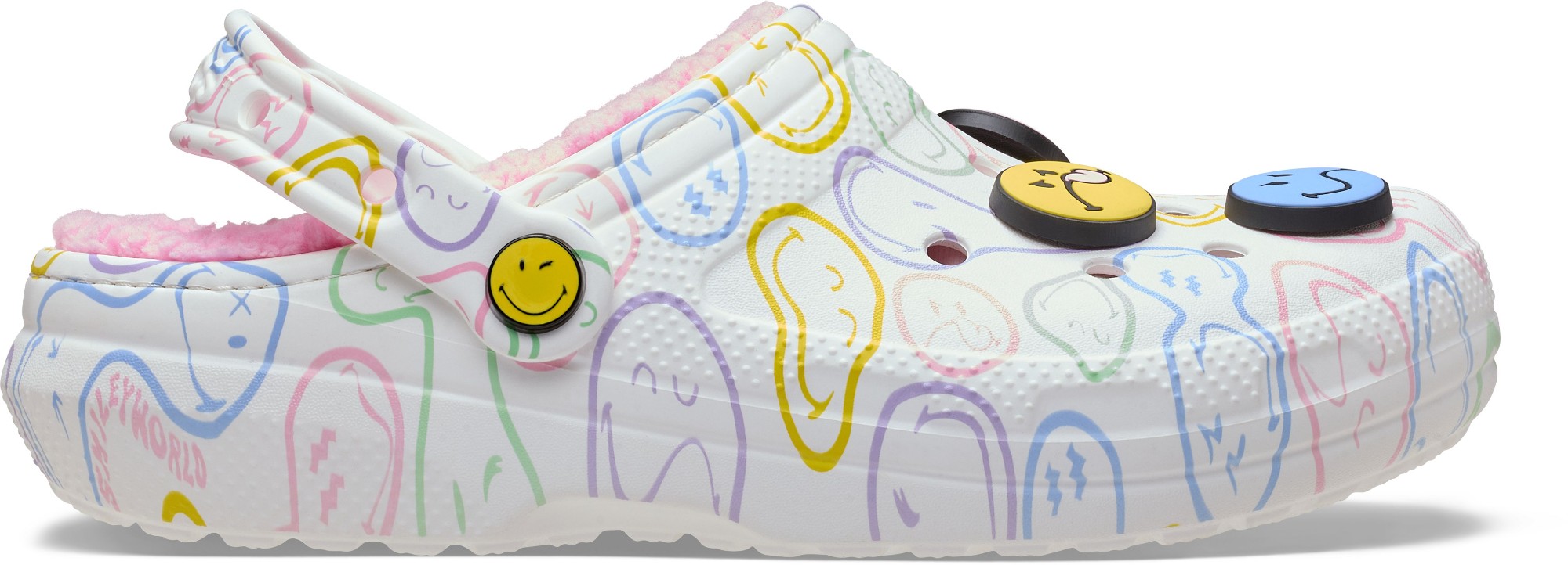 Stay cozy and wear your joy wherever you go in the SmileyWorld® Classic Lined Clog, a plush and playful pair that will have you grinning ear to ear. A fuzz-lined interior and Croslite™ sole supports an upper that features an all-over SmileyWorld graphic print and comes pre-loaded with a colorful collection of Jibbitz™ charms. Additional room on each shoe allows you to add even more personalization depending on your mood. Dial up the smiles in a style that's sure to be your new favorite.