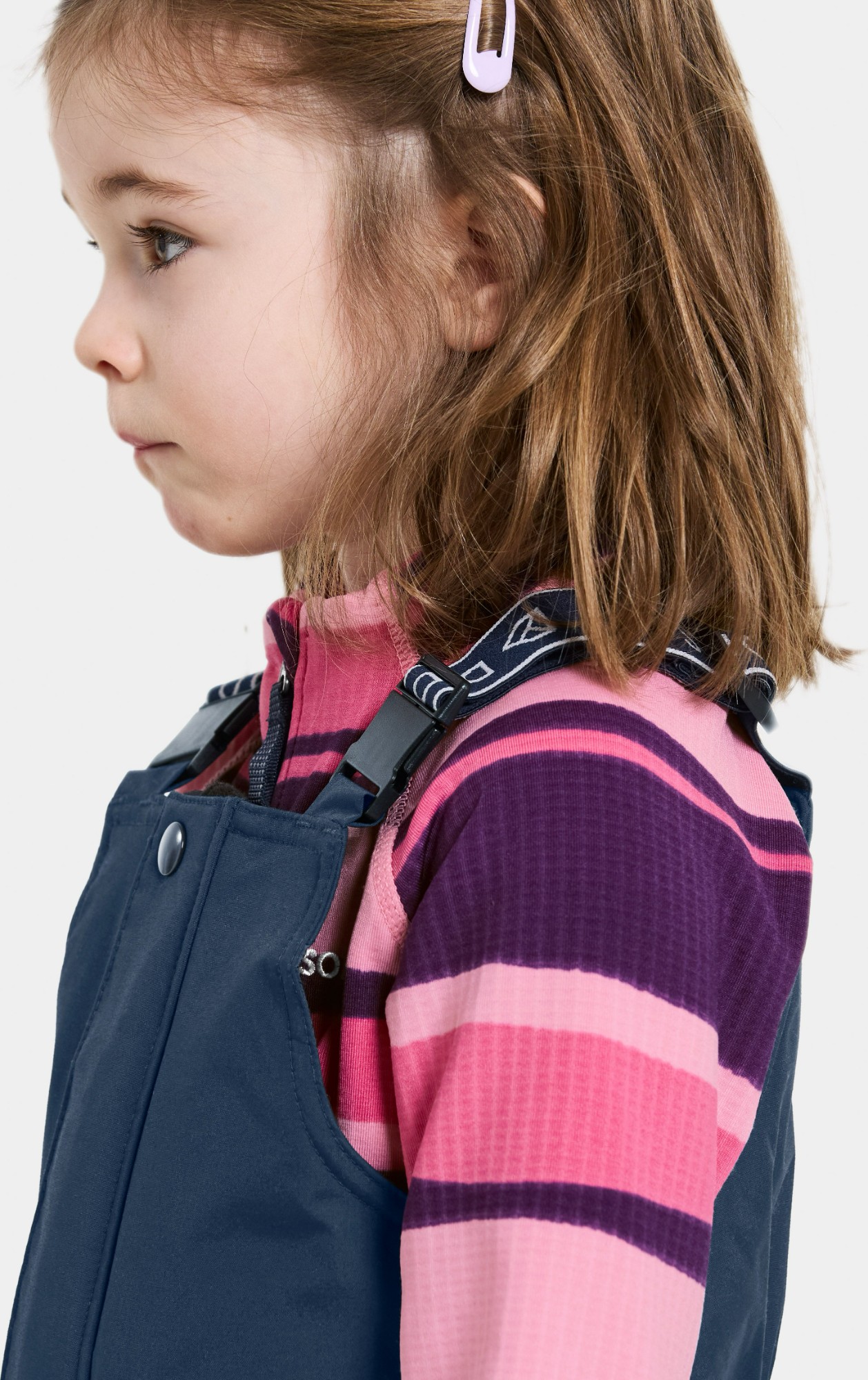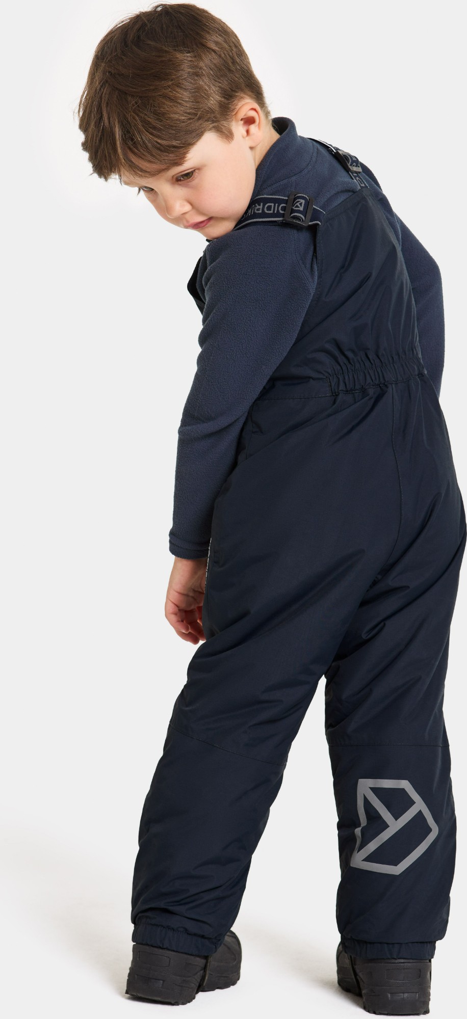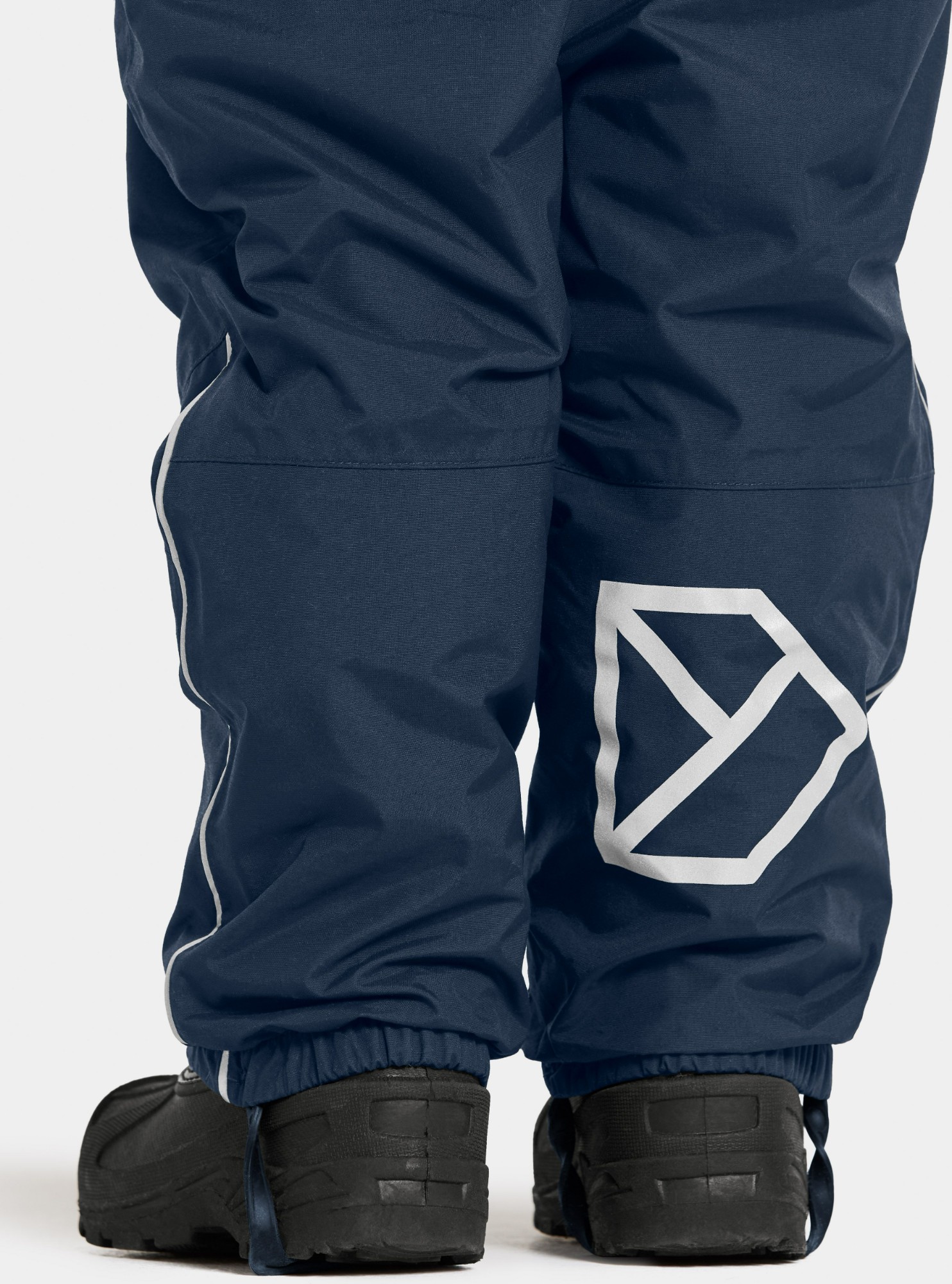 The trousers feature an elasticated waist at the back and adjustable braces for an ideal fit. Durable silicone foot straps and elasticated leg ends keep the trousers securely in place during play. Practical details include a name label with space for multiple names – perfect for handing down or second-hand use. An inner hanger makes them easy to dry after a day outdoors. Reflective details provide increased visibility in low light.