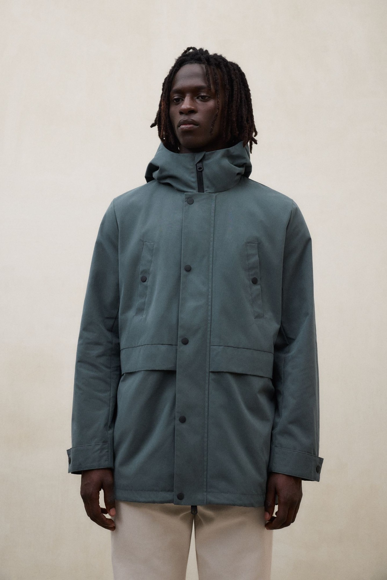 The Gab Jacket is made of 85% recycled polyester. Regular fit. It features a hood and high collar, with a zip-up front. Breast pockets and lower pockets with placket.