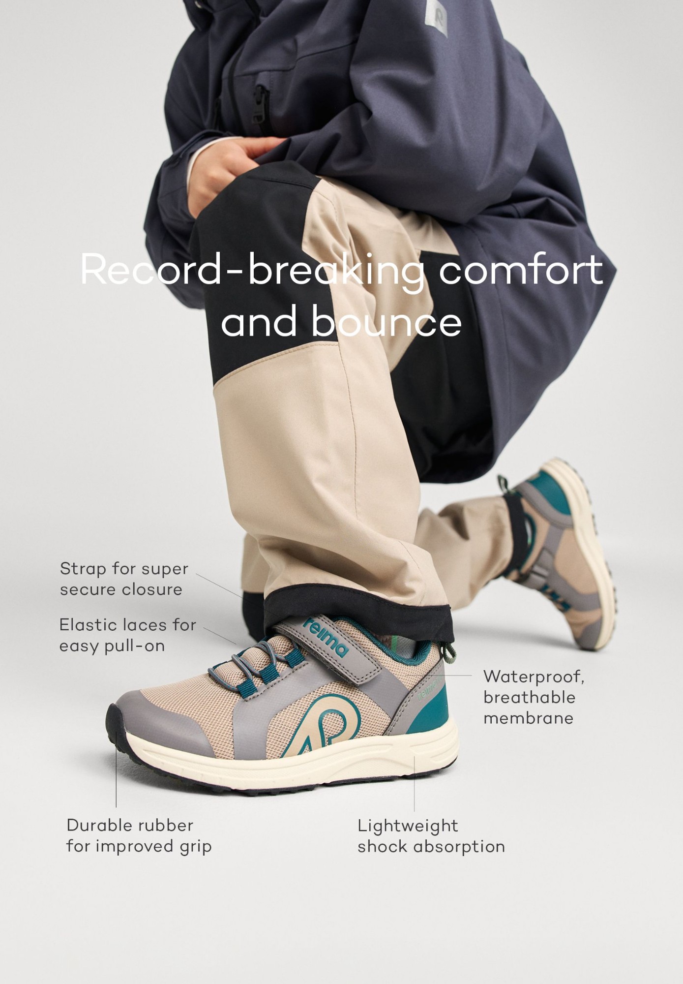 Waterproof Reimatec sneakers. Great lightweight all-round shoes for active kids and juniors. Thermoplastic rubber in the sole improves grip.